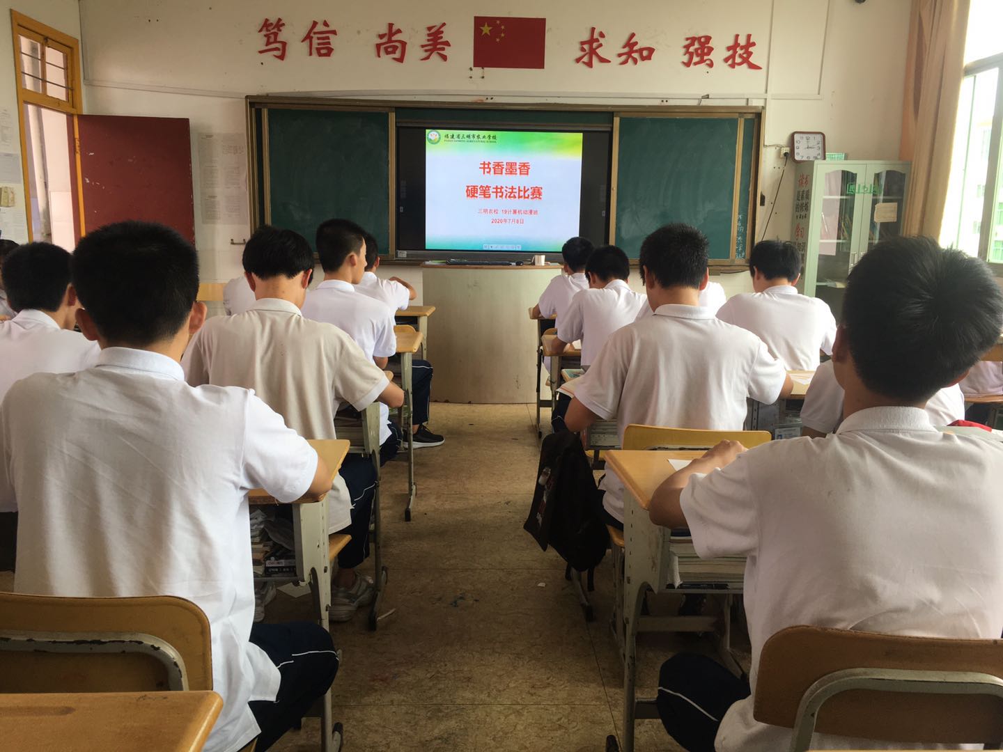 为检验同学们一学年来的练字成效,2020年7月8日下午班会课,19计算机动漫班在班主任李捷彬老师的组织下开展了一场硬笔书法比赛。班级同学自入学以来,班主任就非常重视培养大家形成良好的书写习惯,提高书写水平。班级教室特设了墨轩阁,定期展出班级同学的优秀书写作品。
