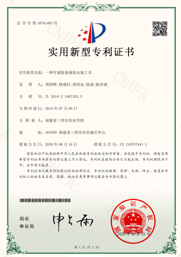 “凡事欲其成功,必须付出代价:奋斗”爱默生的这句格言,对周国辉来说,在他之前多项创新成果取得的过程中,已有深切体会,也磨练了他坚韧的耐受力和抗压力。周国辉还在大学期间,就已有1项发明专利和6项实用新型专利成果,他到三明农校参加工作后,又为学校获取了3项实用新型专利。