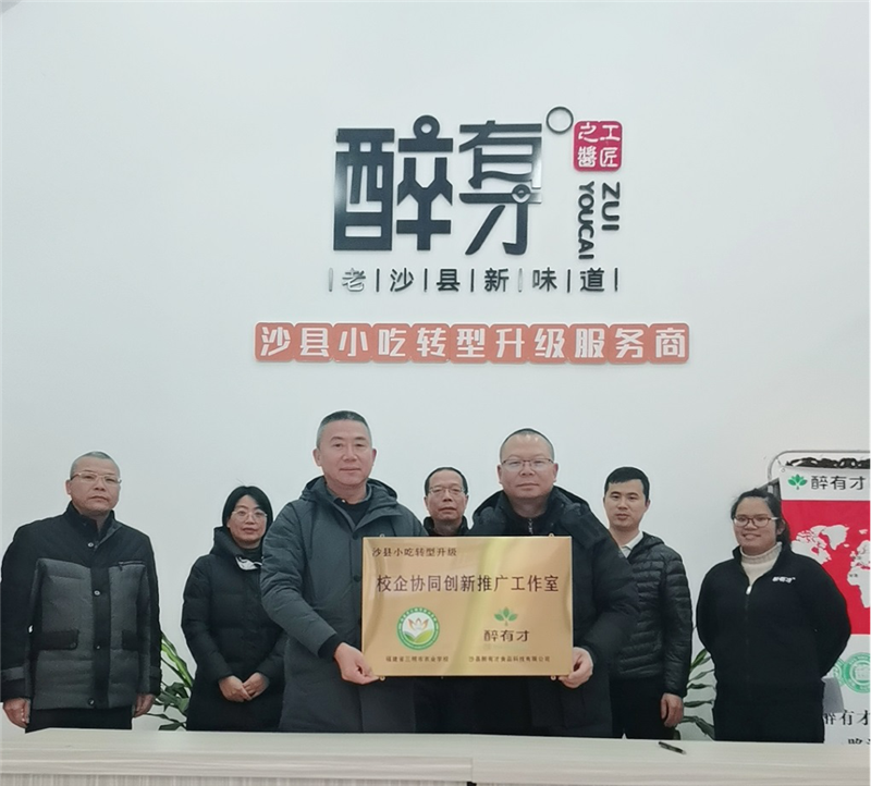 12月17日下午,在位于沙县小吃产业园的沙县醉有才食品科技有限公司内,三明农校谢阳军副校长代表学校与醉有才公司总经理颜发辉签约授牌,达成校企协同创新推广合作协议。