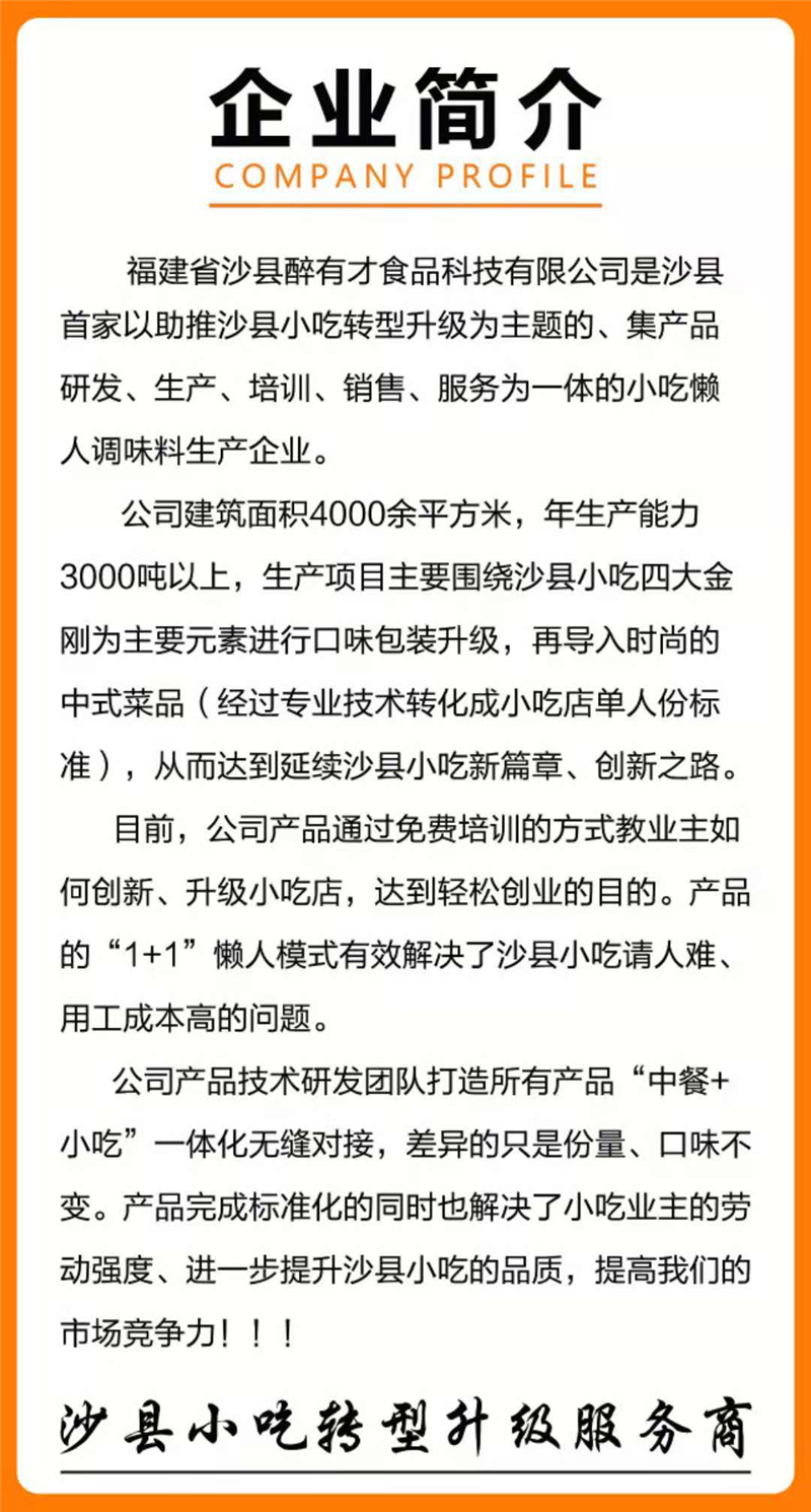 沙县醉有才食品科技有限公司是沙县首家以助推沙县小吃转型升级为主题的、集产品研发、生产、培训、销售、服务为一体的小吃懒人调味料生产企业,目前已自主研发酱料40多款。三明农校与醉有才公司本着优势互补、资源共享、共同发展的原则,以传承、创新“沙县小吃”技艺和推进“沙县小吃”转型升级为目标,从技术研发和培训推广两个方面对接合作。