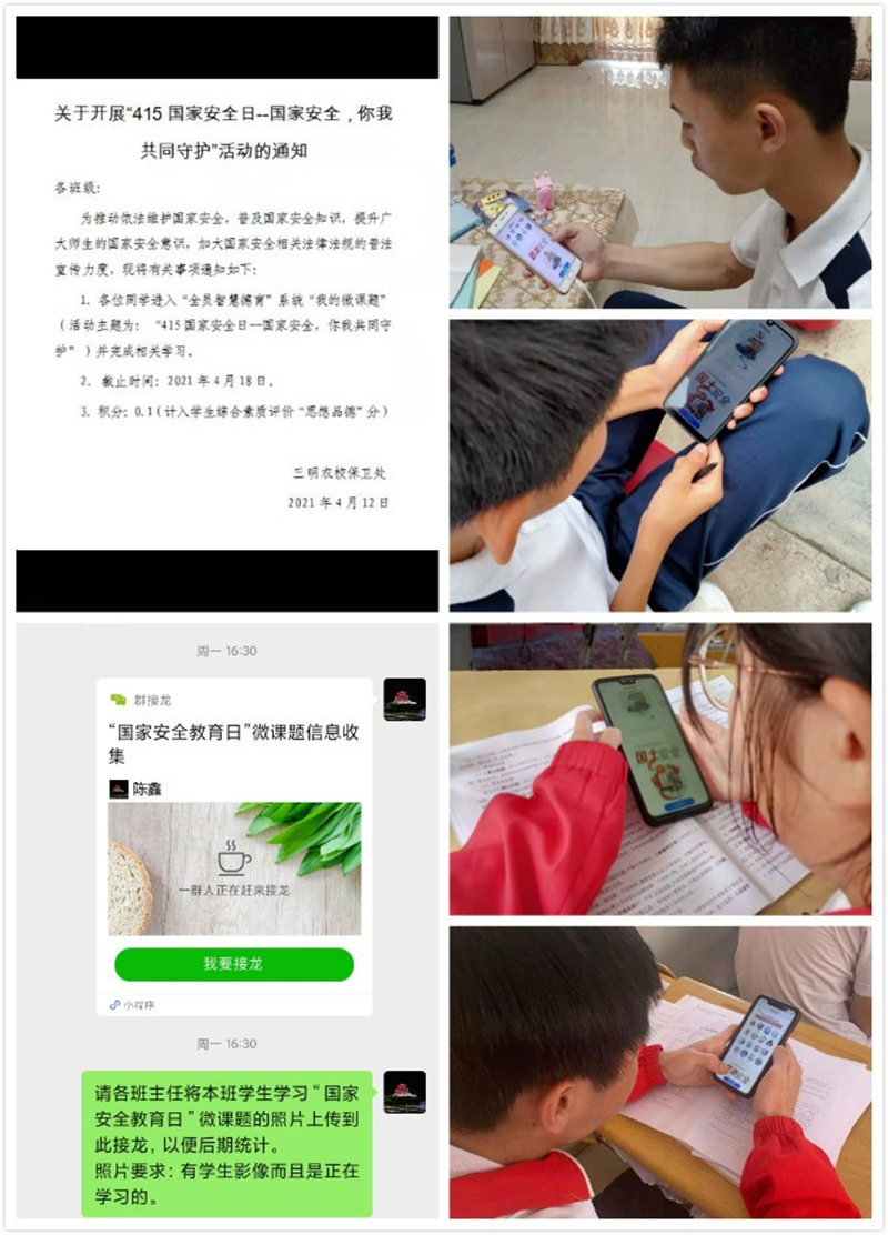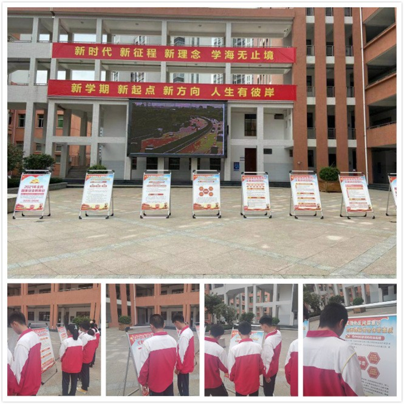 三明农校结合线上线下优势,积极利用线上安全教育平台资源、三明农校全员智慧德育平台,以专题活动、微课题等方式,进一步宣传国家总体安全观、传统安全和非传统安全的相关知识;合理利用线下宣传阵地,通过主教学楼LED字幕、主题班会、户外大屏幕、展板等宣传方式,营造国家安全教育日活动氛围。