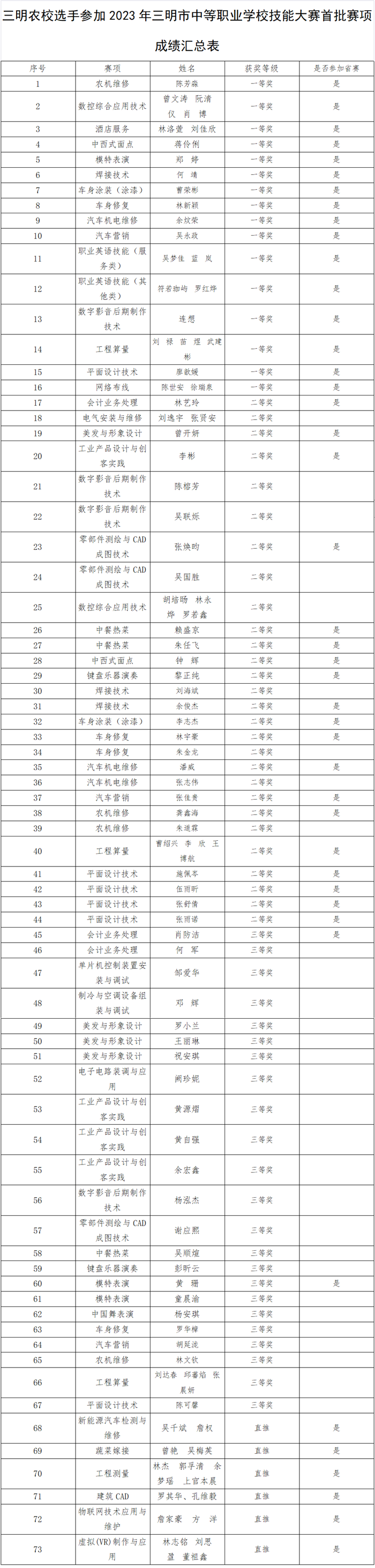 近日, 2023年三明市中等职业学校技能大赛首批赛项已圆满落下帷幕。我校共派出105名学生参加29个赛项的比拼。根据各赛点公布的成绩显示,我校选手共获一等奖16个、二等奖28个、三等奖23个;其中农机维修、酒店服务、车身修复、模特表演、中西式面点等30个项目的62名选手将代表三明市参加福建省中等职业学校学生技能大赛(含6项直推进入省赛)。