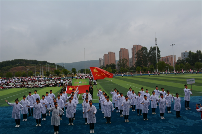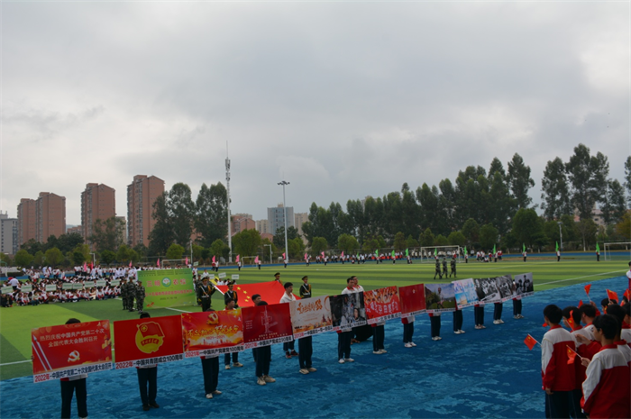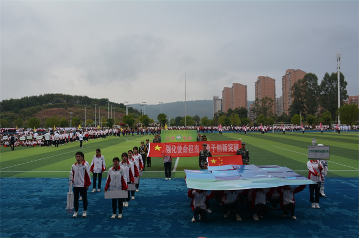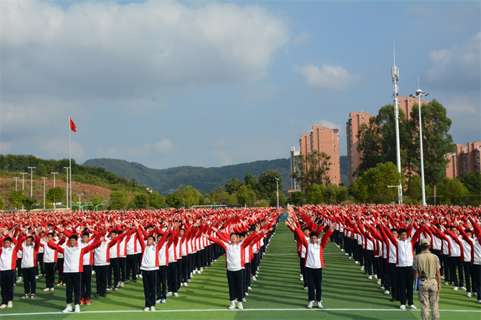 在国旗队、校徽队、彩旗队的引领下,100支由各班级组成的方队,沐浴着秋日的阳光,步履矫健地依次走过主席台。他们朝气蓬勃、意气风发;口号充满自信,铿锵有力。在入场式展示环节,各班同学结合专业特点,扣紧当前深入学习宣传贯彻党的二十大精神的主题,通过独具创意的队列变化、精心编排的文艺表演,凸显了班级文化特色,展示出了新时代青少年蓬勃向上精神风貌,同时也表达了对党和国家、对学校的热爱,“请党放心,强国有我!”的口号此起彼伏,响彻校园。