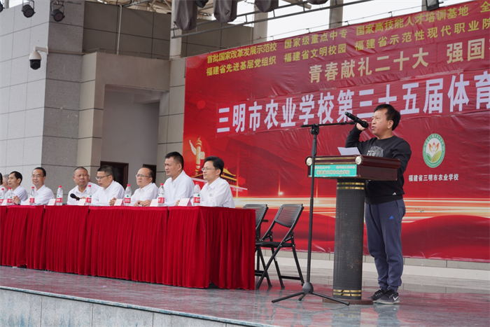 在冯尤彬同学代表运动员和陈成忠老师代表裁判员宣誓后,校运会组委会主任、党委书记、校长罗世钦宣布三明农校第三十五届体育运动会暨科技艺术节正式开幕。