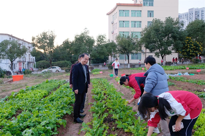 在劳动实践基地,同学们热情高涨,撸起袖子挥锹铲土、浇水施肥,悉心照料着班级的植物。在滴滴汗水里、声声欢笑中,同学们体验了劳动的艰辛,感受了劳动的快乐,收获了劳动的成果。调研过程中,罗世钦书记加入同学们的劳动队伍,拿起锄头和同学们一起感受集体劳动、分工协作的快乐。