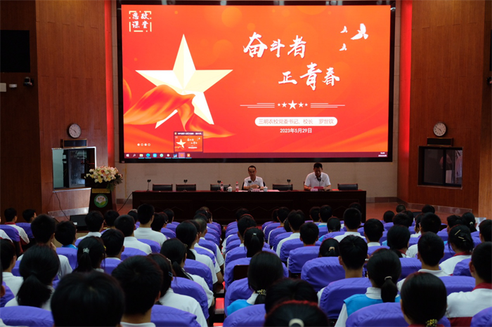 2023年5月29日下午,在三明市农业学校学术报告厅内传出阵阵热烈的掌声,这里正在开展党委书记、校长走进思政课堂活动。三明市农业学校党委书记、校长罗世钦与220多名学生干部做了《奋斗者 正青春》的思政讲座,学校党委委员、纪委书记江文林,党委委员、副校长胡安生等学校党政领导一起聆听讲座,讲座由团委书记官炳火主持。