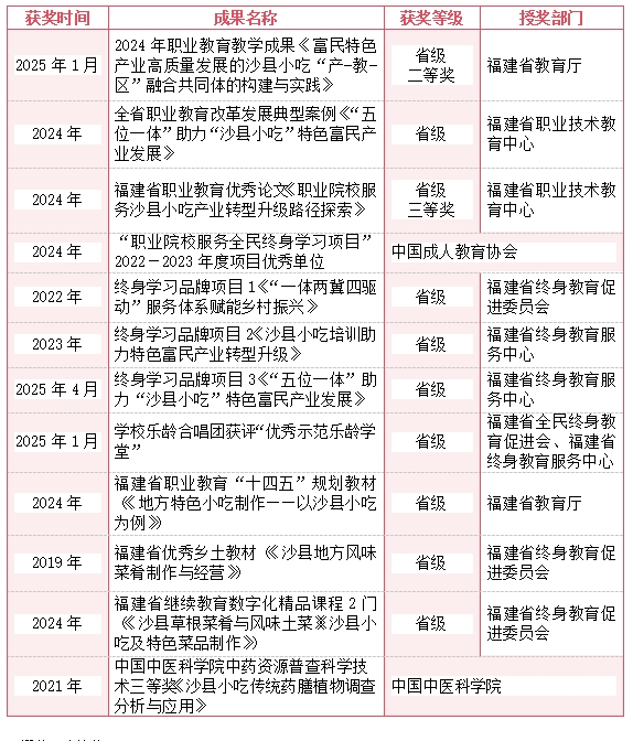 日前,福建省终身教育服务中心发布《关于公布2025年福建省新时代“百姓学习之星”和“终身学习品牌项目”宣传推介名单的通知》(闽终教服〔2025〕3号),共推介51个项目为2025年福建省新时代“终身学习品牌项目”,三明市农业学校推荐的《“五位一体”助力“沙县小吃”特色富民产业发展》荣登榜单。至目前,学校共拥有三项省级“终身学习品牌项目”。