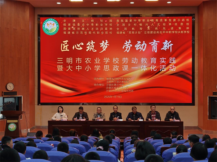 2026年1月19日,三明市农业学校举办“匠心筑梦 劳动育新”劳动教育实践暨大中小学思政课一体化活动。活动以劳动为核心纽带,深度串联红色基因传承与产教融合实践,通过学段衔接赋能、公益暖心传递、家校社协同联动的多元形式,让劳动这一“刻在骨子里的基因记忆”在青少年心中生根发芽,为大中小学思政课一体化建设奏响生动鲜活的育人乐章。