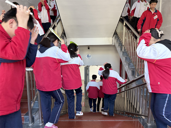 待第二阶段疏散警报声响起,班主任立即下达疏散指令,学生按照预定疏散路线,有序撤离,在操场指定位置集合。演练中,学生弯腰低姿、双手牢牢护住头部,靠右有序快速撤离,不推搡、不滞留、不逆行。各楼层、楼道转角、楼梯口等关键点位的引导人员坚守岗位,提醒师生注意脚下安全、保持安全间距,及时疏导人流、防范拥挤踩踏风险。
