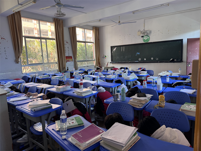 15时30分,第一阶段地震警报声响起,学生立即双手抱头、蜷缩身体,快速躲避到课桌、办公桌下方或承重墙根、墙角等安全区域,用手臂或书本护住头部颈部,原地避险。全程保持安静、不慌乱喧哗,严格遵循避险要领做好自我防护。