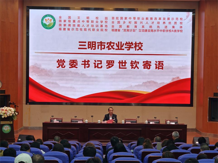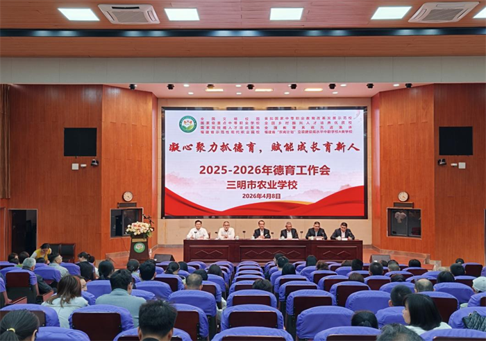 2026年4月8 日,三明市农业学校在校报告厅召开2025 年德育工作会,以“凝心聚力抓德育,赋能成长育新人”为主题,全面总结2025年学校德育工作成效,系统部署2026年重点任务,进一步统一思想、凝聚共识,推动学校德育工作高质量发展。党委书记罗世钦携在校的党政领导班子出席会议,全校教职工参会。